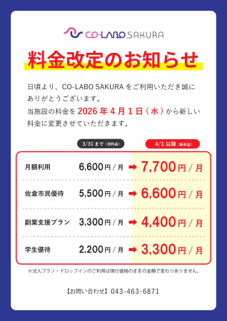 | 月額利用 | 6,600円 / 月 ※1 ※佐倉市民は5,500円/月 |